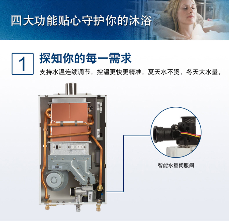 智能恒溫控制系統(tǒng),超寬頻水量調(diào)節(jié)。通過搭載伺服電機(jī),根據(jù)設(shè)定溫度連續(xù)調(diào)節(jié)水量,舒適節(jié)能到極致。一氧化碳探測報警器,細(xì)心呵護(hù)您的安全。更有多點控制,可連接兩個遠(yuǎn)程遙控器, 控制更方便快捷。