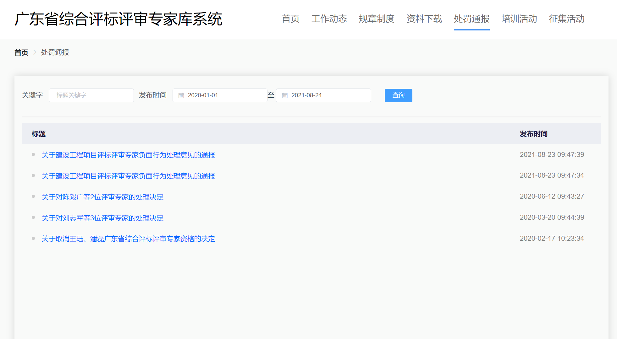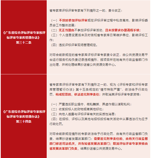 2020年至今,廣東省綜合評標(biāo)評審專家?guī)煜到y(tǒng)共對15名評標(biāo)專家進(jìn)行處罰通報,其中違反《廣東省綜合評標(biāo)評審專家和評標(biāo)評審專家?guī)旃芾磙k法》第三十二條規(guī)定的評標(biāo)專家共13人,5人因無正當(dāng)理由不參與評標(biāo)評審活動,且未按要求辦理請假手續(xù)、不按時參加評標(biāo)評審活動被責(zé)令改正,其余8人因遲到、缺席等負(fù)面行為被責(zé)令改正并記入違規(guī)記錄;2名評標(biāo)專家因犯串通投標(biāo)罪,違反《廣東省綜合評標(biāo)評審專家和評標(biāo)評審專家?guī)旃芾磙k法》第三十四條被取消廣東省綜合評標(biāo)評審專家資格并永久移除出庫。