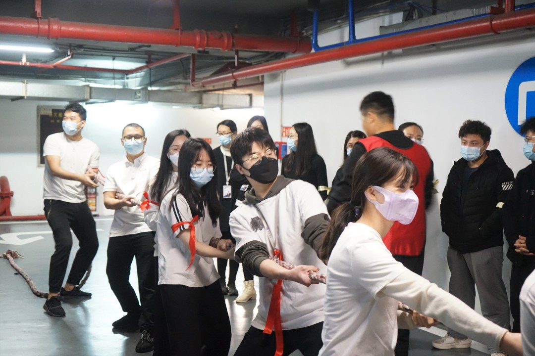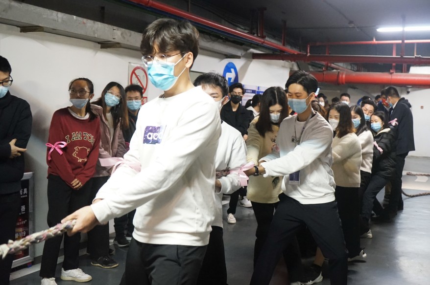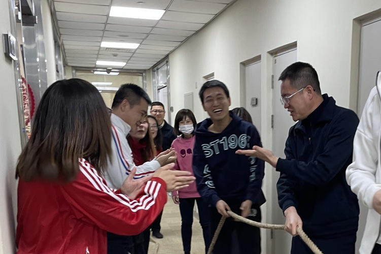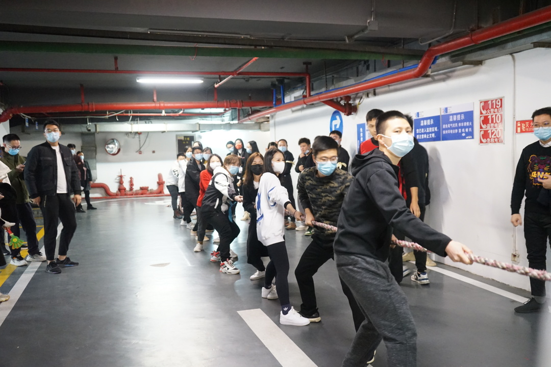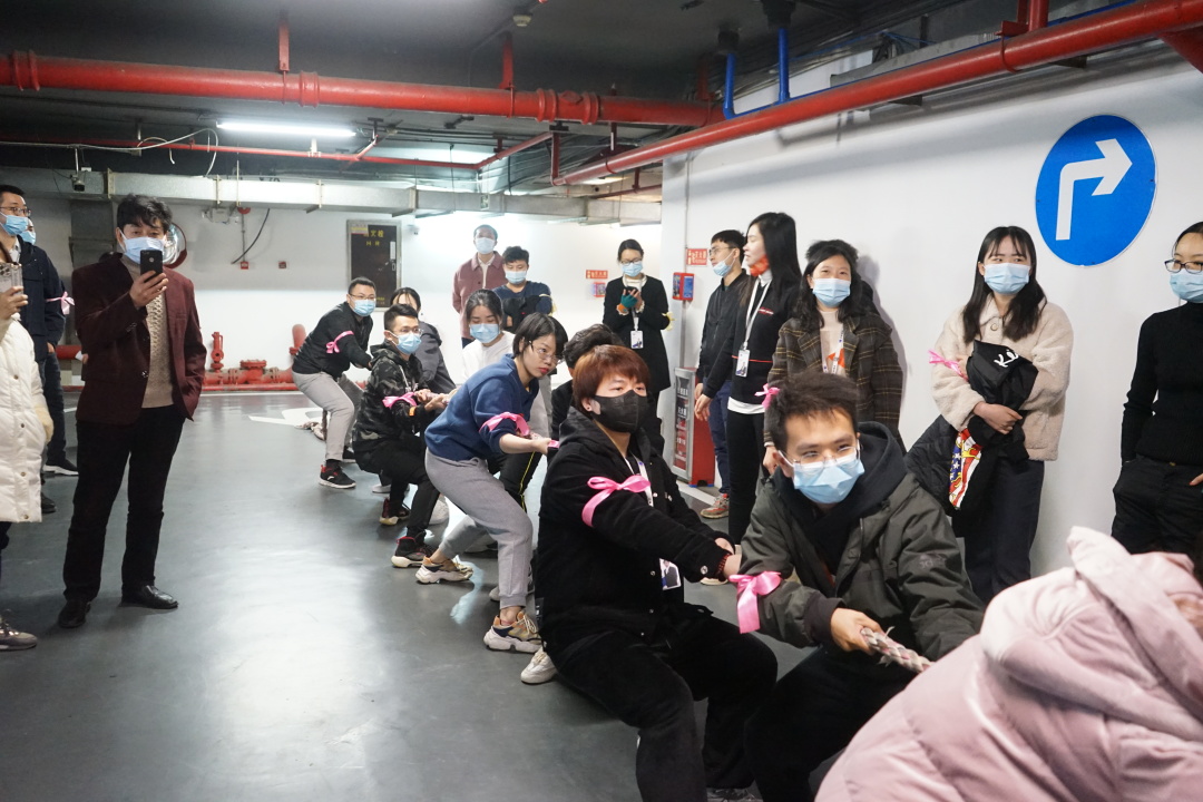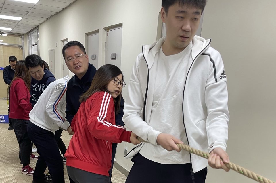 再觀北京分會(huì)場,參賽職員身穿中國紅運(yùn)動(dòng)服,寓意新的一年紅紅火火,同時(shí)也為冬奧會(huì)加油助威?,F(xiàn)場由飛虎隊(duì)和龍騰虎躍隊(duì)進(jìn)行回合制的拔河競賽。在每一回合結(jié)束后,雙方進(jìn)行了認(rèn)真的戰(zhàn)術(shù)討論和調(diào)整,經(jīng)過激烈的比拼,最終龍騰虎躍隊(duì)稍勝一籌,在“一二、一二”的號(hào)子聲中,取得了比賽的勝利。